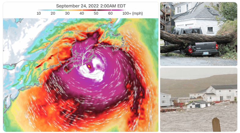 So although Fiona had technically transitioned from a “hurricane” to a post-tropical cyclone by the time it reached Canada, it still packed full hurricane-force winds and an enormous wind field — causing widespread destruction, downed power lines, collapsed barns, and loss of animal shelters and feed throughout Nova Scotia, Prince Edward Island, and Newfoundland (and parts of Quebec.)